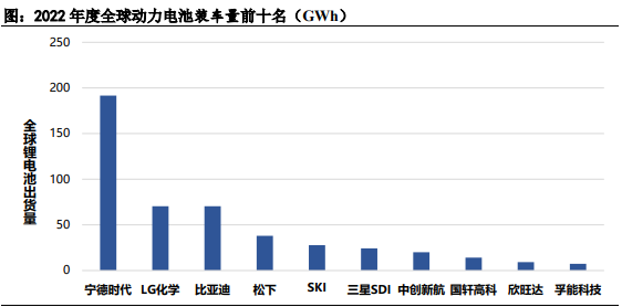 根据统计数据,2022年度全球动力电池装车量达517.9GWh,同比增长71.8%;其中,TOP10企业的全球动力电池装车量高达473.2GWh,占比91.37%,前五名分别为宁德时代、LG化学、比亚迪、松下、SKI。