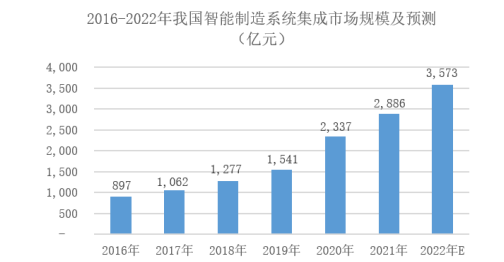 我国智能制造系统集成市场空间大。2016-2021年,我国智能制造系统集成市场规模由897亿元增长至2,886亿元,年均复合增长率为26.33%。随着我国庞大工业体系智能制造需求的持续释放,行业有望实现加速发展,2022年我国智能制造系统集成市场规模将迅速增长至3,573亿元。