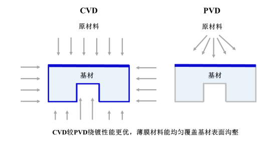 2)化学气相沉积技术(CVD):化学气相沉积技术较物理气相沉积技术绕镀性能更佳,能够覆盖更复杂、更精细的表面结构,更适合为精密部件制备纳米薄膜。