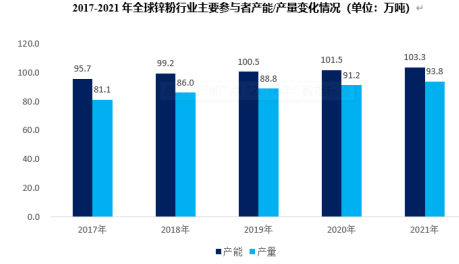 2017-2021年,全球锌粉行业市场规模呈现逐年增长的态势,锌粉产能及产量稳定增长。2019年,全球贸易摩擦不断,经济呈现下行趋势;2020年,新冠疫情爆发,对全球工业产生了巨大的冲击。但受益于下游涂料行业广泛的应用领域,全球锌粉主要产能及产量仍呈现稳步增长状态,2021年,全球锌粉行业主要参与者的产能达到103.3万吨,产量实现93.8万吨。
