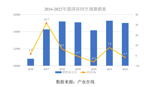 2022年全年,虽然空调行业面临内外销双重压力,但中国空调行业韧性较强。2022年我国空调产业总销量15,004万台,同比下降1.7%。其中内销和出口分别下降0.5%和3.2%,出货有小幅波动。2016-2022年我国房间空调器销售情况如下: