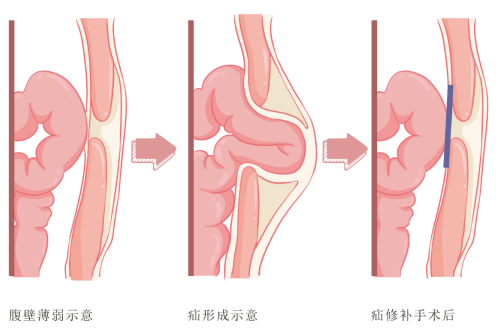 成人疝无法自愈,目前无张力疝修补术为临床治疗疝气的主要方法,《成人腹股沟疝诊断和治疗指南(2018年版)》明确指出,目前成人腹股沟疝只有通过外科手术治疗才能获得痊愈,非手术方法无法治愈。疝修补手术采用疝修补片加强缺损的组织,具有无缝合张力、手术损伤小、恢复快、疼痛感小、复发率低的特点。以腹部疝为例,对疝的临床表现简要示意如下: