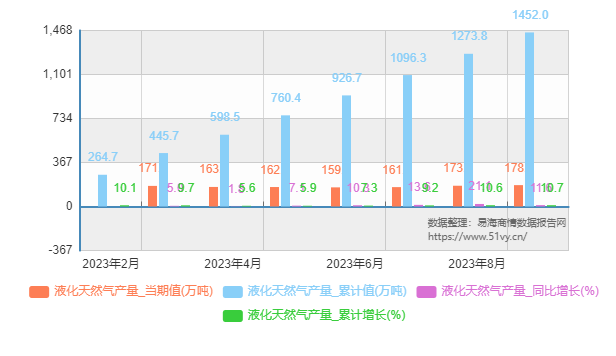 图表解析:2023年2月-9月液化天然气产量当期值、累计值、同比增长率数据图表